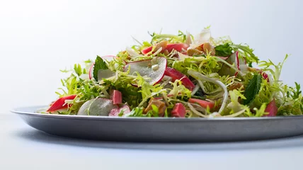 - Make the salad: In a large bowl, toss together the frisée, mint leaves and radishes with the vinaigrette to coat. Transfer to a platter and top with pickled rhubarb and Marcona almonds. Garnish with the Pecorino Romano, then serve.