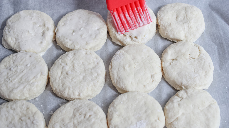 Line a baking sheet, then arrange the biscuits so they are touching one another. Brush the tops with the cream at this point. Morone does say that, "If you don't have heavy cream you can use milk or half and half ... all three will help make the tops of the biscuits a nice golden brown." If you like salty stuff, go ahead and sprinkle some flaky sea salt onto the un-baked biscuits, as well.