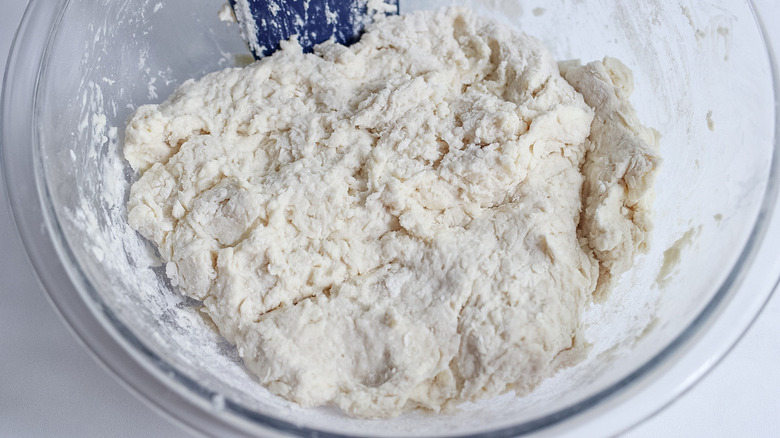 - Mix the buttermilk into the flour mixture until it forms a dough.