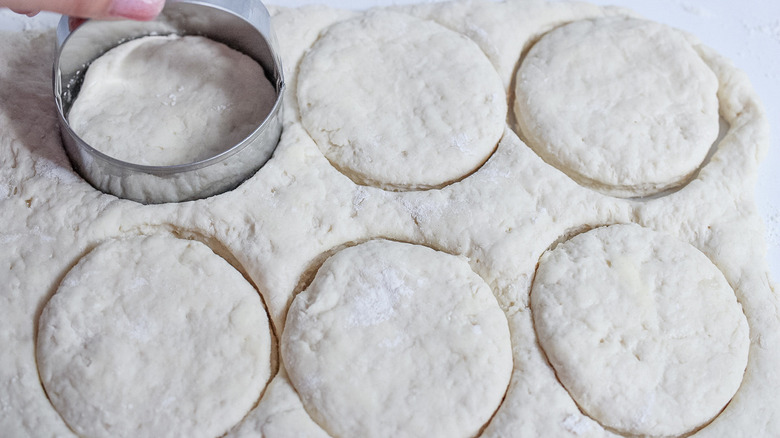 Take a biscuit (or cookie) cutter or even a drinking glass that's about 2 ½ inches in diameter and use it to cut out circles of dough. Once you've cut out all of the circles you can, squish the remaining dough into a smaller rectangle and keep on cutting. When you get down to the last bits of dough, you may have to hand-form the final biscuit into a circle as best you can to avoid any square edges going to waste.