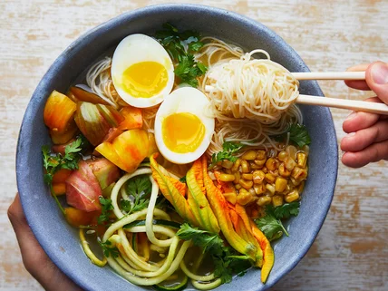 - In each bowl, divide the noodles, corn, tomatoes and spiralized squashes in piles next to each other. Divide the broth between the bowls, then cut each egg in half and nestle on top of the noodles. Garnish with cilantro leaves and squash blossoms, then serve.