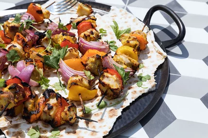 Serve the skewers over flatbread and let the juices soak into the lavash so not one drop of flavor is wasted. Then, encourage your guests to rip off pieces of flatbread to make little wraps with the chicken and vegetables. If you can't get your hands on lavash, fear not: Pita works just as well.