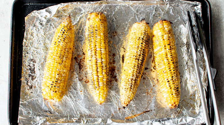 While you might expect to use a grill in a recipe like this, you'll actually broil the corn, a method that McGlinn says is "super quick and still achieves a char like the grill would." Not everyone has access to a grill, but if you have an oven, then you likely have a broiler, so this special method is quick, accessible, and easy. So, go ahead and get the broiler preheating on high, then place the top rack at the top of the oven (it should be about 3 or 4 inches below the broiler).