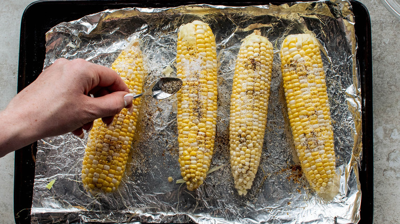 3. Brush the corn on all sides with vegetable oil, then sprinkle with salt and pepper. Arrange on a foil-lined sheet pan.