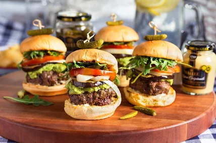 - To assemble the burgers, generously spread the garlic mayonnaise on both sides of each burger bun. Place a burger on each bottom bun, then top with a quarter of the mashed avocado, grilled onions, grilled eggplant, sliced tomato, cornichons, arugula and the top bun. Repeat with the remaining burgers and serve.