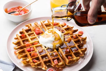 - To serve, place a waffle on a plate and spoon the poached rhubarb and its liquid over top. Dollop with whipped cream and finish with maple syrup.