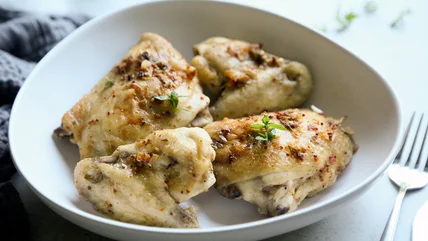 It's best not to sub out the ingredients for what you have on hand, as each item plays a specific role. "The olive oil will lend a neutral taste to the seasonings while also assisting in cooking and making the garlic and [chicken] skin crispy," Alton explains. "Along with the garlic, the Aleppo pepper offers a hint of spice, while the thyme lends perfume and earthiness."