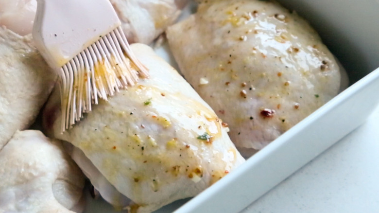 - Using a brush, apply the marinade to the top of the chicken, flip each piece over, and repeat until all pieces are covered.