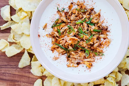 - Transfer the fondue to a bowl and top with the blackened crab. Garnish with thinly sliced scallions, then serve with potato chips.