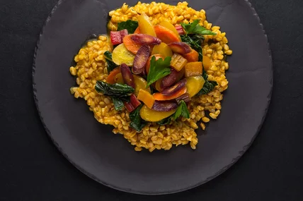 Renowned chef Michael Anthony brings us this colorful and delicious, vegetable-forward dish with farro, Swiss chard and sautéed glazed rainbow carrots.