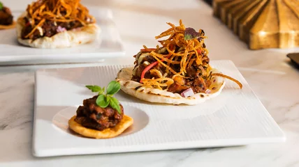 - Using a 3-inch ring cutter, cut out circles from the tortillas to form mini tacos. Spoon 2 tablespoons of filling onto each tortilla round. Garnish with minced onions, Thai chiles, grated Parmesan and fried papads, then serve.