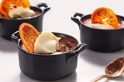 This thick, rich dessert is like a hybrid of a chocolate truffle and chocolate pudding. We add a little seasonal citrus to the mix by pairing it with blood orange and finishing it with whipped mascarpone and a candied blood orange wheel. It's an easy yet sophisticated dessert that will make you feel better than any Hallmark sentiments could.