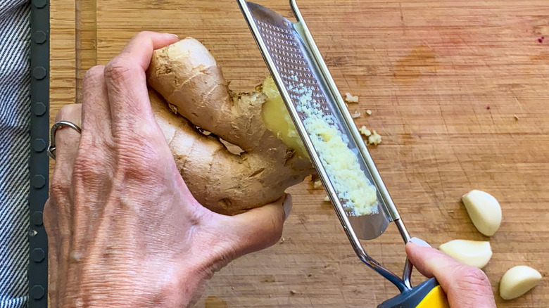- While that is cooking, chop the shallot, mince the garlic, grate the ginger, and dice the chili.