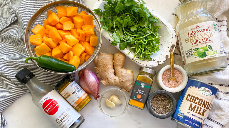 Ready to start? You'll need a little bit of oil for cooking, along with a butternut squash, salt, a shallot, fresh ginger, garlic cloves, a serrano chili, lemongrass paste, ground turmeric, cilantro, lime juice, coconut milk, and soy sauce. Once you have those items, you can get started on this Thai-style butternut squash soup.