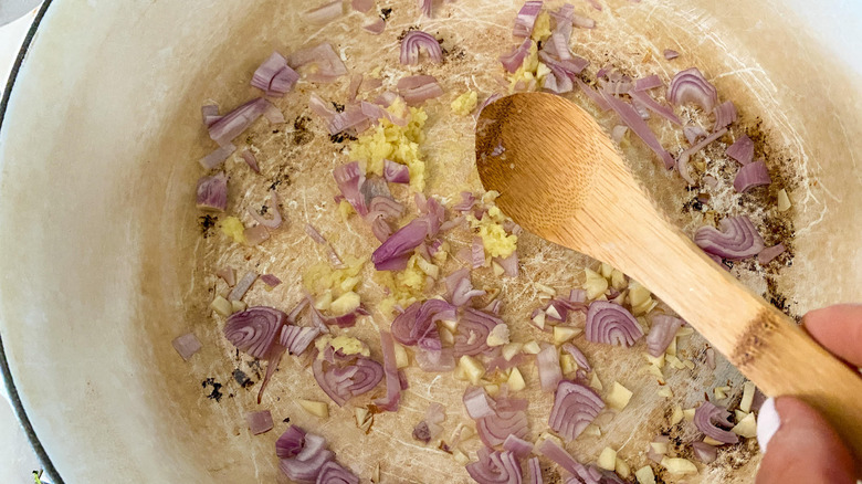 - In a soup pot, add oil and bring heat to medium-high. Add the shallot, ginger, and garlic. Sauté while stirring for 2 minutes.