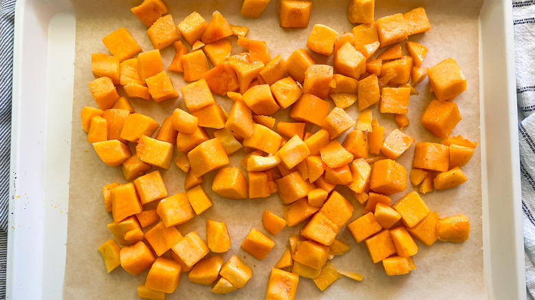 Then, grab a bowl and the cubed butternut squash. Drizzle in some oil and a ½ teaspoon of salt on top of the squash. Shake the bowl to coat the squash in oil and salt, which adds a nice flavor and base for roasting. Once your oven has finished preheating, transfer the squash to a baking sheet and bake for 30 minutes.