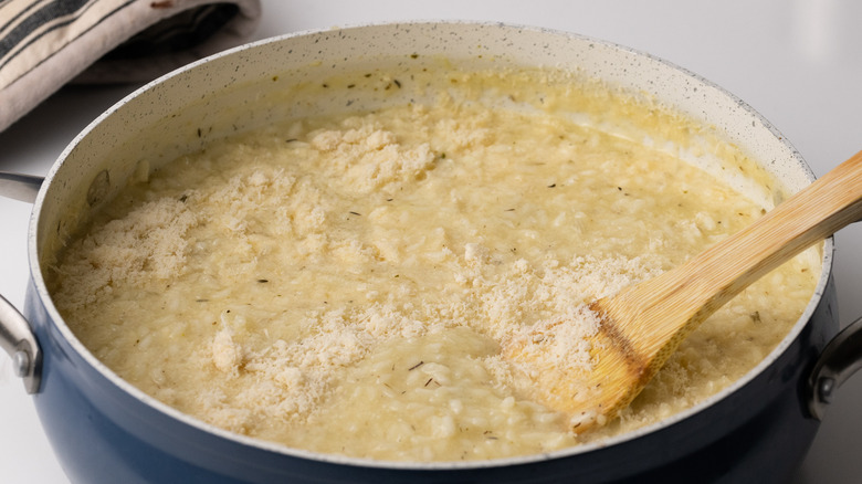 - Take the risotto off the heat and whisk the butter in using a balloon whisk to emulsify it, making it light and velvety. Then, stir in the grated Parmesan, the lemon juice, and season to taste.