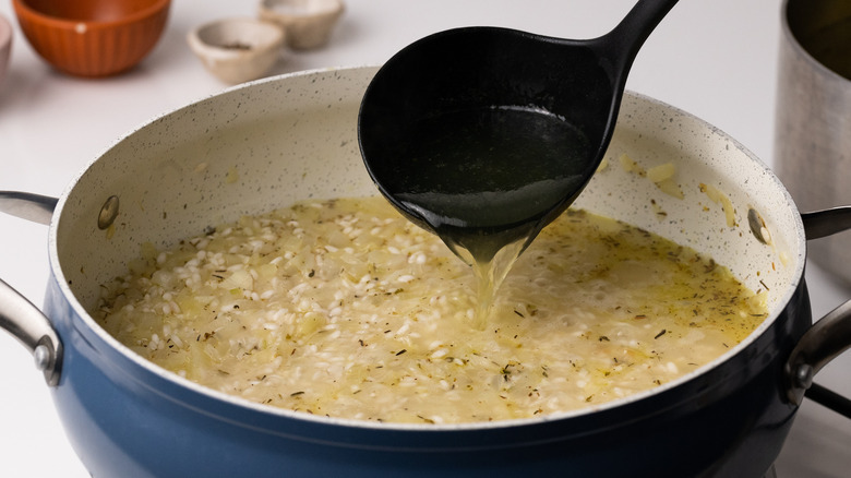 - Add the warm stock to the pan 1 cup at a time, stirring it into the rice. As the rice absorbs the stock, continue to add it 1 cup at a time and stir regularly, until all the stock has been used up.