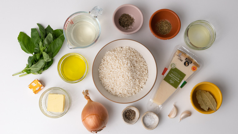 To make this Parmesan risotto, first you will need to gather the ingredients. You will need chicken or vegetable stock, Parmesan and a Parmesan rind, bay leaves, olive oil, butter, an onion, garlic, white wine, arborio rice, thyme, oregano, lemon juice, salt and pepper, and fresh basil to serve.