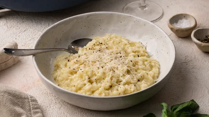 When the Arborio rice is cooked, turn off the hob and stir in the butter. For the best results, we recommend using a balloon whisk and stirring vigorously; this will help the liquid from the risotto and the fat from the butter to properly emulsify, creating a delicious velvety finish to the dish. Then, stir in the lemon juice and the grated Parmesan, before seasoning the dish with salt and pepper. Serve the finished Parmesan risotto with finely chopped basil and further grated Parmesan if desired.
