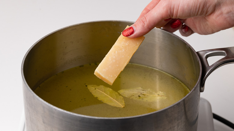 - Add the stock, Parmesan rind, and bay leaves to a large saucepan and bring to a gentle simmer, stirring to infuse the flavor of Parmesan through the stock. Keep the stock to a simmer as you begin the risotto.