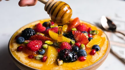 - Divide between bowls and top with fruit, toasted pistachios and honey, then serve.