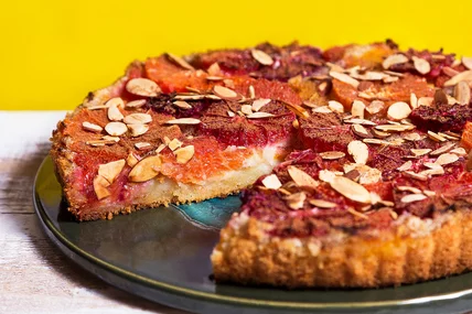 - Pour the batter into the cocoa powder-dusted tart pan and shingle with the orange and grapefruit segments. Bake until a toothpick comes out clean when inserted into the center, 45 to 50 minutes. Let the tart cool completely, dust with the remaining cocoa powder and sprinkle with sliced almonds.