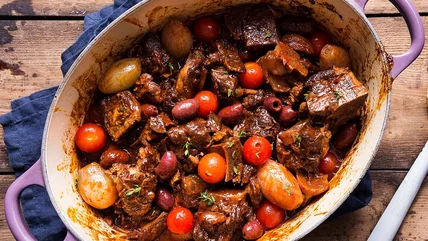 - Remove the pot from the oven and transfer the lamb and shallots to a bowl. Strain the cooking liquid, discarding the vegetable solids, then return it to the pot, along with the cooked lamb and shallots, cherry tomatoes and olives. Season with salt and pepper, then serve.