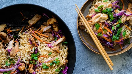 Leftovers? Those can be stored in an airtight container in the refrigerator for up to 2-3 days, per Murphy. "To reheat, you can either use the microwave or stovetop. If using a microwave, cover the container with a microwave-safe lid or plate and heat in short intervals, stirring in between. If using the stovetop, reheat in a skillet over medium heat, stirring occasionally," she details. The next time you have chicken, noodles, and some veggies at home, you'll know exactly what to do.