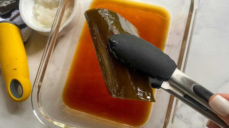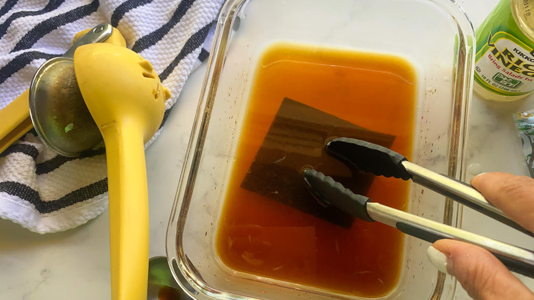 After you let everything sit in the marinade, you can remove the kombu strip from the liquid. It should be pretty soft, which means there's a chance that it will break into little pieces. If this happens, just be sure to remove all of the little pieces from the liquid.