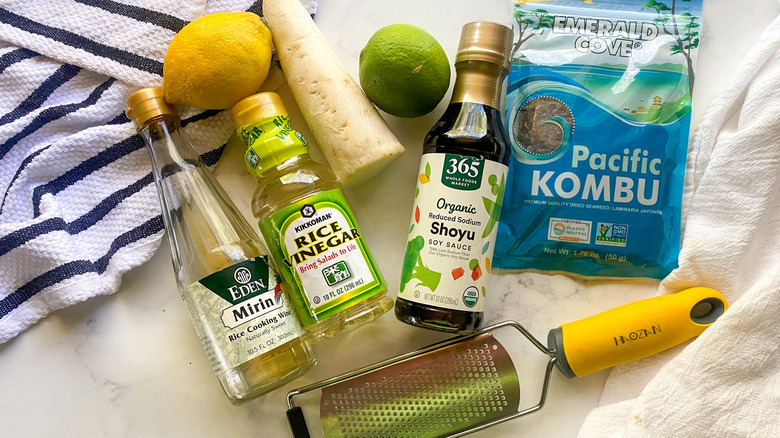 Start things off with a trip to the store. You will need Shoyu sauce, fresh lime and lemon juice, rice vinegar, mirin, kombu (which is dried seaweed), a daikon radish, and optionally scallions for topping.