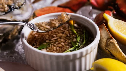 LeFevre's pro tip when serving a mignonette with oysters: Use a fork to dress them, not a spoon. The point is to add just the pickled shallots to the oyster, not the vinegar, which will overpower the flavor of the oyster.