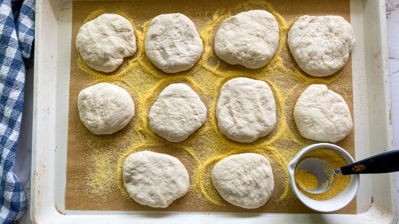 - Lay out some parchment paper on a large baking sheet. Spread half of the cornmeal onto the parchment paper. Divide the dough into 10 equal sections. Roll each section into a ball, flatten into a round disc, and place on the prepared parchment paper. Spread the remaining corn meal on the tops of the English muffins. Cover, and let sit for 30 minutes.