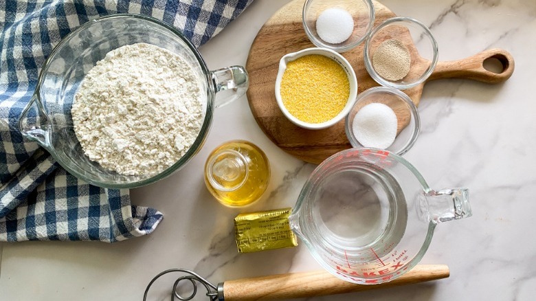To make this recipe, you'll need some bread-baking basics. For the dry ingredients, we'll need some sugar, instant dry yeast, salt, all-purpose flour, and cornmeal. "I like to use instant dry yeast for this recipe because it speeds things up a bit. The cornmeal [prevents] the English muffins [from] sticking to the pan when cooking, and also gives them that sandy texture they are known for. You can substitute farina or semolina flour if you have one of those on hand instead," Hahn shares. Then, you'll need warm water to activate the yeast, some butter, and oil.