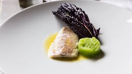 Delicate branzino fillets are poached in Pernod before getting topped with a yuzu butter sauce, grated cucumber and mustard greens.