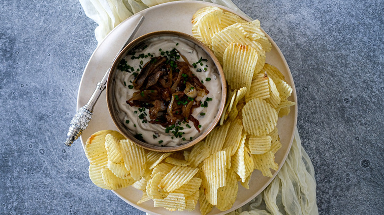 Transfer the dip to a serving bowl and top it off with the remaining half of the caramelized onions. Then, garnish the final dish with chives and perhaps a sprinkle of sea salt, if desired. Pair the dip with a big pile of potato chips and get to dunking — you won't want to miss out on one second of this rich, creamy, savory goodness.