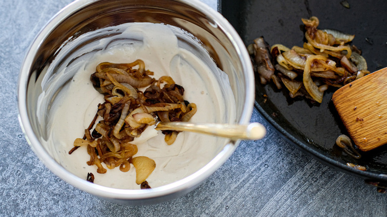 - Add half of the caramelized onions and shallots to the dip and mix well.