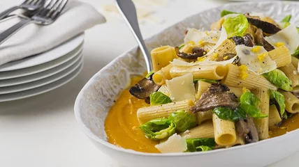 Elevate your dinner party from everyday to gourmet with the Barilla Collezione pasta line and discover how this artisanal collection of bronze cut pasta is perfectly designed to hold sauce. Impress your friends and family, and serve up this delicious seasonal recipe that combines meaty roast mushrooms and spiced butternut squash purée into one effortless dish.