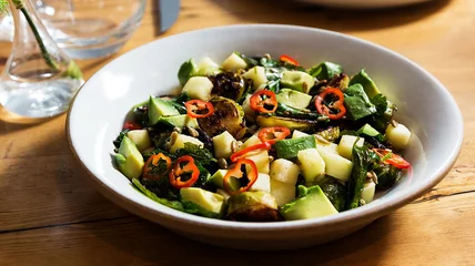 - Drizzle the Brussels sprouts with the dressing, then spoon the apple mixture over top. Scatter the dish with the diced avocado. Garnish with thinly sliced red finger chiles, lime zest and flaky sea salt, then serve.