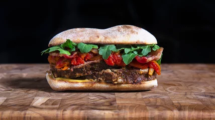 - Assemble the sandwiches: Spread aioli on both sides of each ciabatta roll. Top each with 2 slices of meat loaf, 2 slices of bacon, some tomato jam and a handful of arugula. Close each sandwich and serve.
