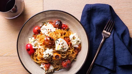 - Bring a large pot of salted water to a boil. Cook the angel-hair pasta until al dente, 4 to 5 minutes. Strain the pasta, reserving ½ cup of the pasta cooking liquid. Add the pasta to the skillet of sauce with the reserved cooking liquid. Season with salt and pepper, then transfer to a platter. Scatter the burrata over top, then drizzle with rosemary oil, garnish with a few fried rosemary leaves and serve.