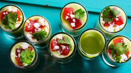 - Divide the soup between small shooter glasses and garnish each with watermelon, queso fresco and cilantro, then serve.