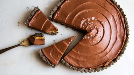 - Assemble the tart: Spread the praline in a smooth layer on the bottom of the tart. Spread the chocolate mixture over the praline, swirling the top with an offset spatula. Garnish with flaky sea salt and serve.