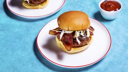 - Assemble the burgers: Put the patties on the grill and brush the top of each with the BBQ sauce. Cook, flipping once and brushing with more BBQ sauce, until charred and medium rare, 3 to 4 minutes per side. After flipping, sprinkle the blue cheese crumbles over the tops of the burgers to let melt slightly.