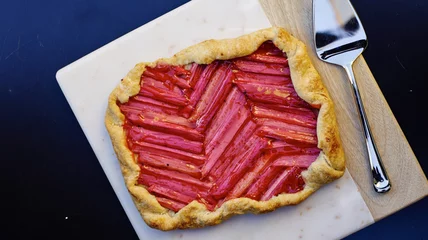 - On a lightly floured work surface, roll out the dough to ⅛ inch thick (should be 13 to 14 inches in diameter). As you roll, adjust and press in edges if they break or crack for a more uniform shape. Transfer the dough to the baking sheet by gently folding it in thirds and unfolding it onto your baking sheet, or rolling it up on the rolling pin and gently unrolling it onto the parchment paper. Place the rhubarb sticks around the edges, about an inch in, and roll the dough over the fruit to form a raised "crust," and pinch to seal. Proceed covering the dough, arranging the sticks in a geometric pattern, cutting pieces to fit as necessary. Bake for 40 to 50 minutes, until the crust is golden brown, rotating the baking sheet about halfway through.