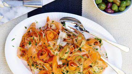 This is an easy-to-throw-together side dish that adds a nice hit of brightness and acid to any cheese or meat board. It has a whimsical appearance with its ribbon-like form and can be made several days ahead with the fresh herbs added shortly before serving.