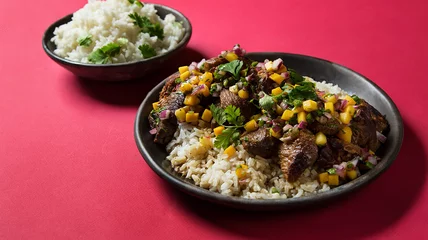 - Divide the steamed rice between bowls. Using a slotted spoon, place some pork over the rice and top with a spoonful of the mango salsa. Garnish with cilantro leaves and serve.