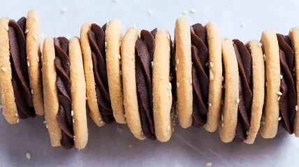 A staple ingredient in Middle Eastern cooking, tahini is a rich sesame paste that you've probably eaten in hummus. However, with a high fat content (good fat, of course), it works wonders in baking as well. Tahini adds an intense nuttiness to these cookies, as well as their chocolate ganache filling.