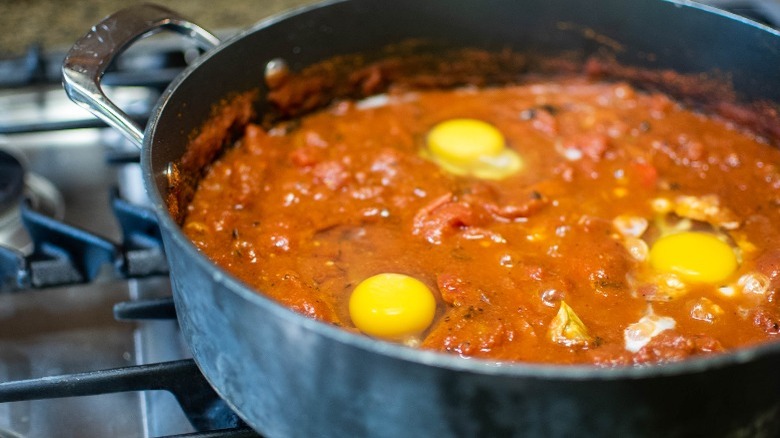 What do you think of when you think of brunch? Scrambled eggs with potatoes and toast? Eggs Benedict with smoked salmon? A short stack of pancakes for the table? If your usual brunchtime fare is getting a bit monotonous, why not switch things up and make some shakshuka? A warm, savory dish combining eggs and seasoned, saucy tomatoes, shakshuka is a common morning meal in Israel. It has roots in northeast Africa, per The Culture Trip, and became popular for its convenience, affordability, and bold flavors. This shakshuka recipe by Michelle McGlinn is easy to put together and its combination of spices and fire-roasted tomatoes will surely wake up your taste buds.