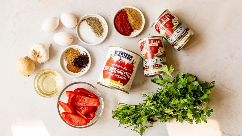 Don't be intimidated by the lengthy ingredient list here — it's mostly spices and pantry staples, and it'll give the finished product an unforgettable taste. The seasonings you'll need are cumin, paprika, sumac, coriander, cinnamon, and salt and pepper. Produce-wise, you'll need red bell peppers, fresh garlic, yellow onion, and parsley. You'll also need eggs, of course, plus canned tomatoes (both whole and fire-roasted) and olive oil.